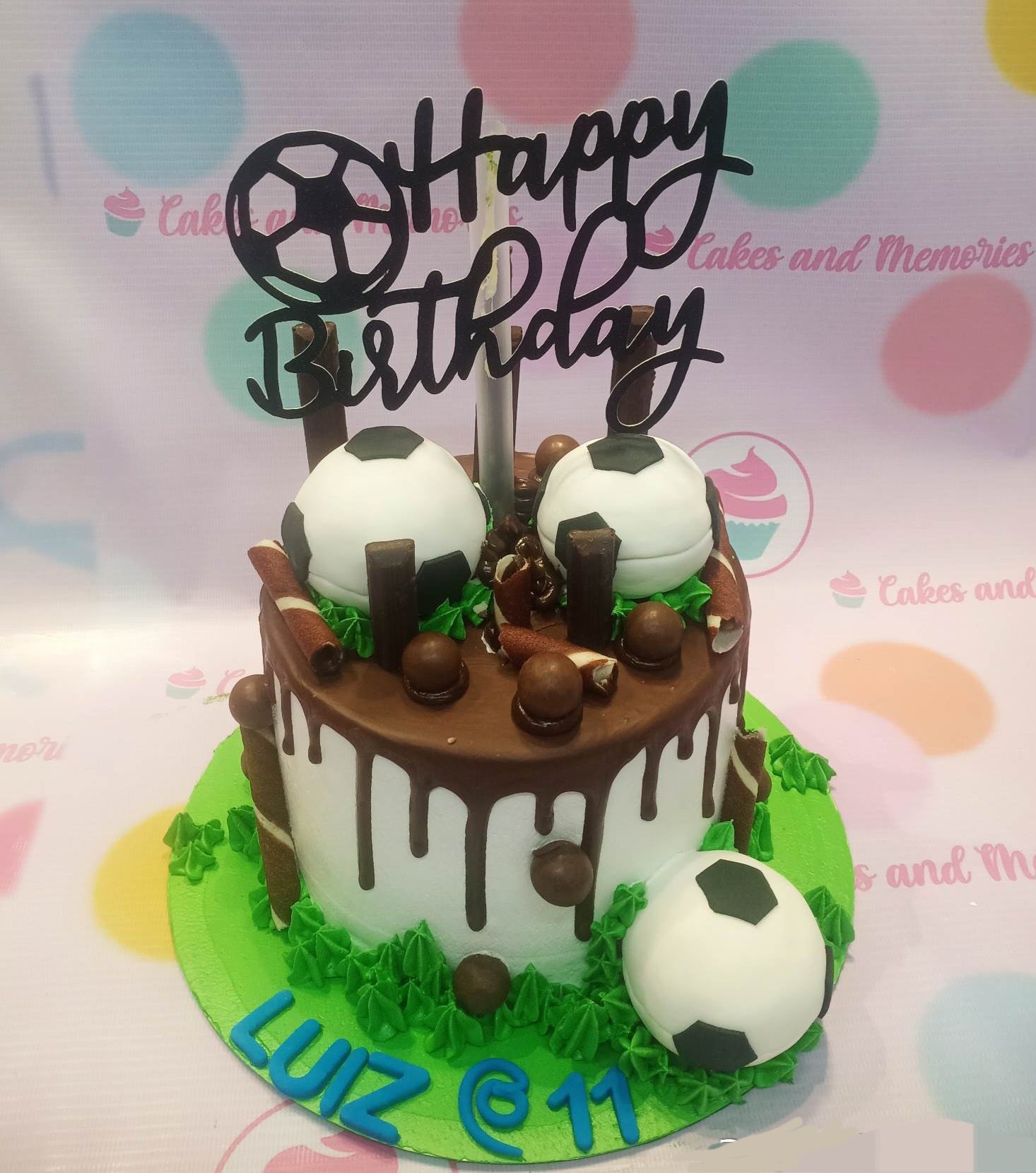 Soccer themed birthday cake with chocolate drip, fondant soccer balls, and chocolate treats on a green grass-like base.