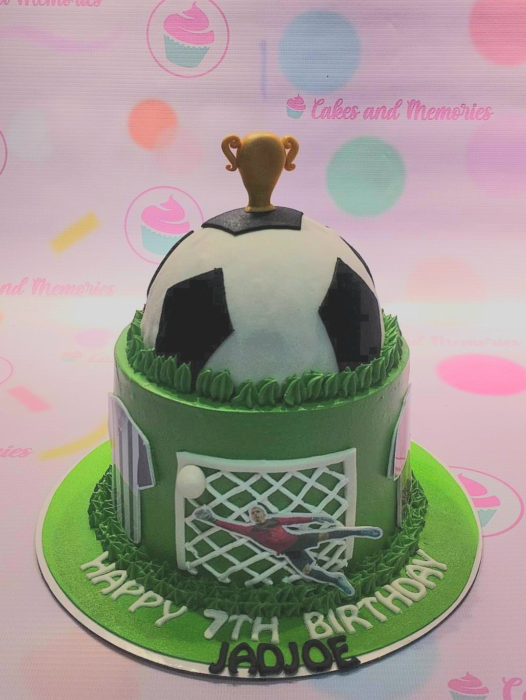 Soccer themed birthday cake with a 3D soccer ball top, green grass icing, and a goalkeeper printout on the side.