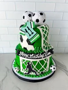 Two-tier green soccer themed birthday cake with fondant soccer balls, a jersey topper, and a goal net design.