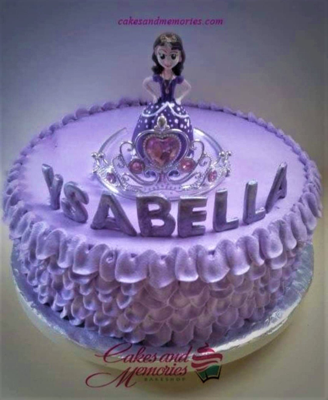 Purple Sofia the First themed cake with a princess figurine, silver tiara, and ruffled icing texture.