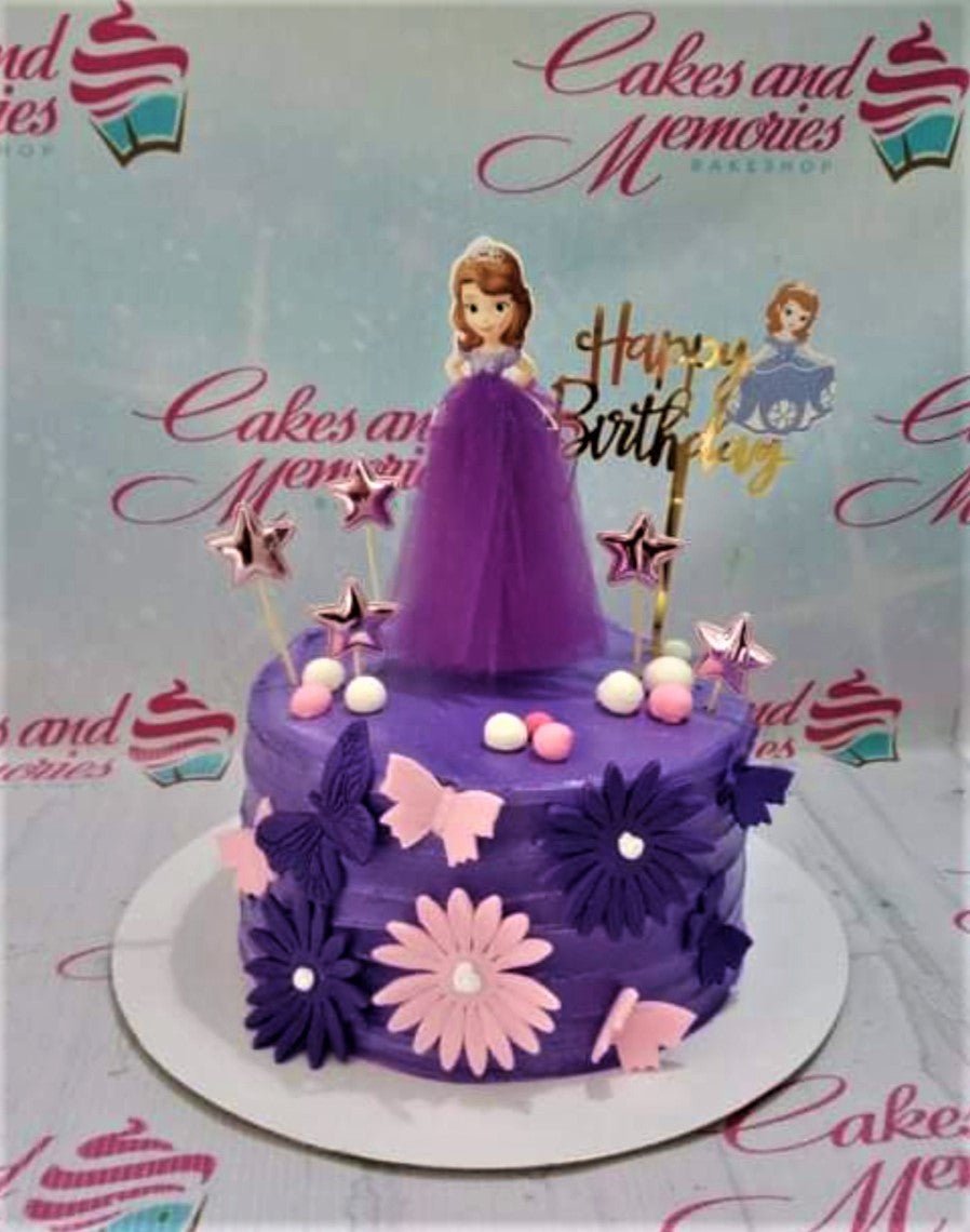 Purple Sofia the First themed birthday cake with a tulle-skirted princess topper, pink and purple flowers, and gold stars.