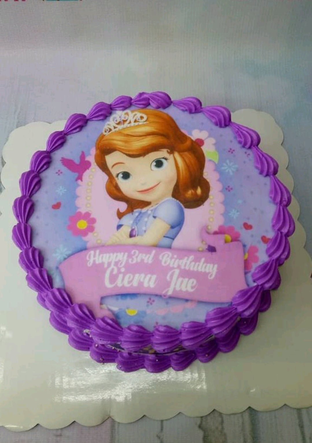 Sofia the First themed birthday cake with purple icing borders and a large character printout on top.