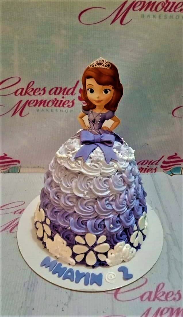 Sofia the First themed doll cake with purple and white ombre icing rosettes and a character printout topper.