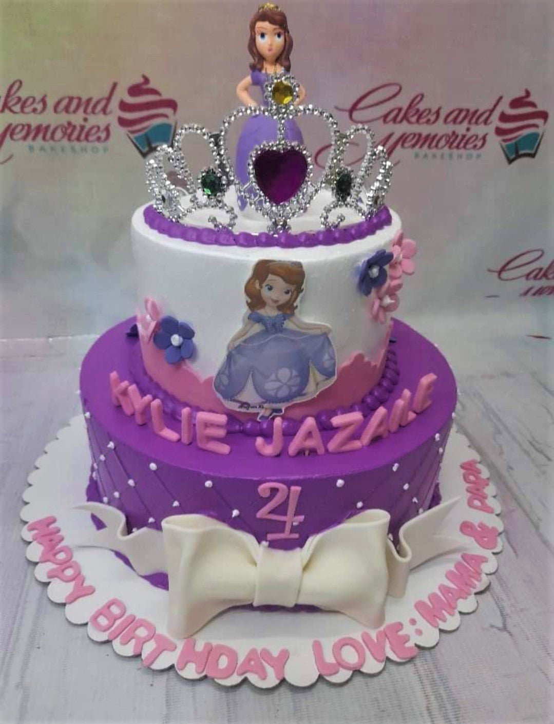Two-tier Sofia the First themed cake in purple and white with a princess figurine, silver tiara, and pink fondant flowers.