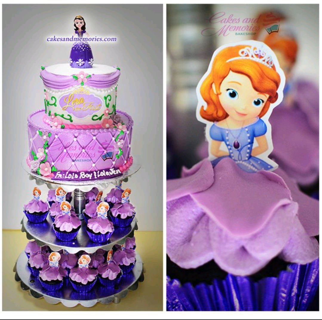 Two-tier Sofia the First themed cake in purple and white with a princess topper and matching cupcakes.