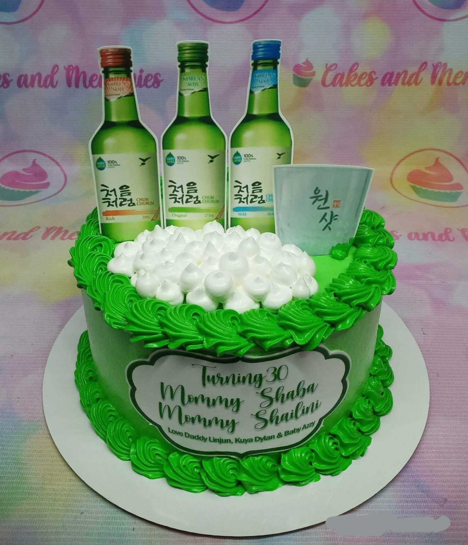 Green Korean Soju themed birthday cake with three printed soju bottles, a shot glass, and white icing dollops.