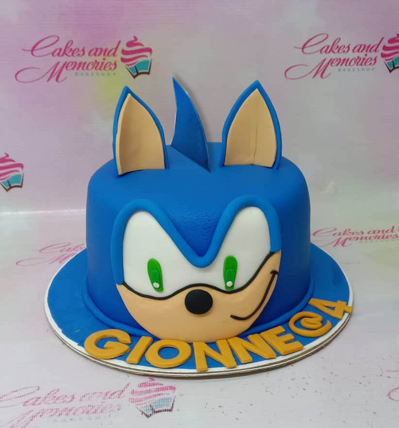 Sonic the Hedgehog character cake with blue fondant, 3D ears, and yellow gumpaste name letters on the base board.
