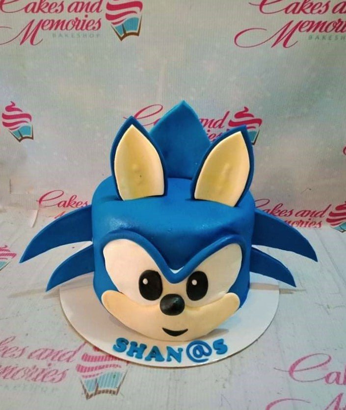 Sonic the Hedgehog character cake with blue fondant spikes and a detailed fondant face on a white base board.