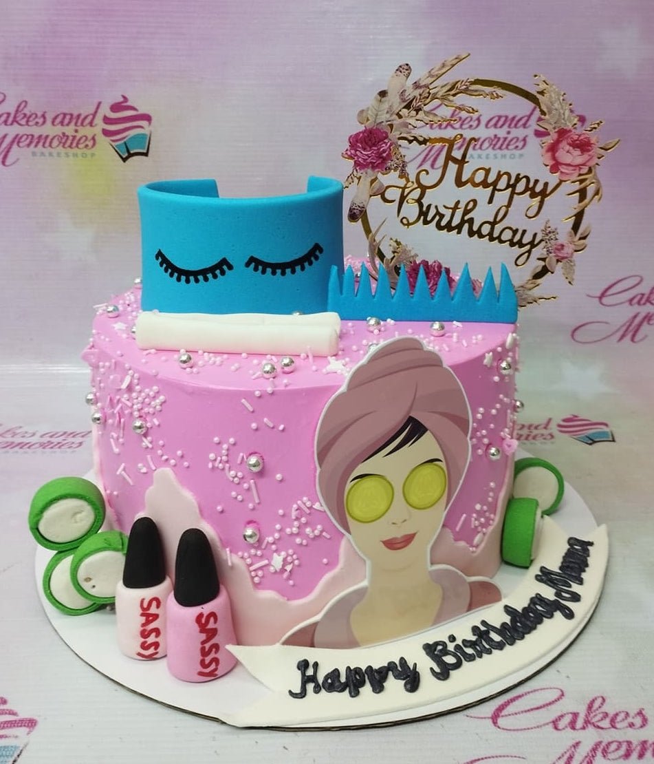 Pink spa themed birthday cake with a woman in a towel wrap, nail polish bottles, and cucumber slices.