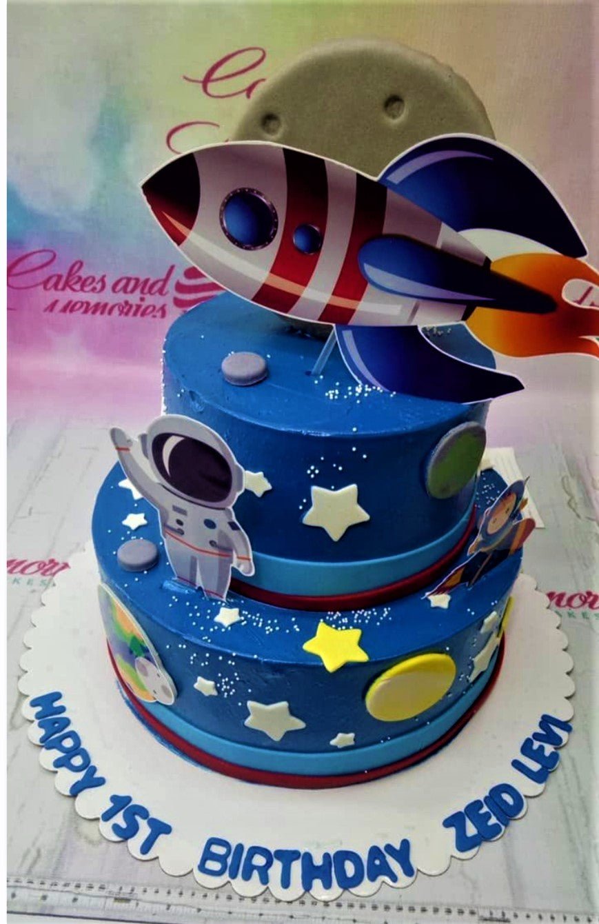 Two-tier blue space-themed birthday cake with rocket, astronaut, and moon toppers, decorated with stars and planets.