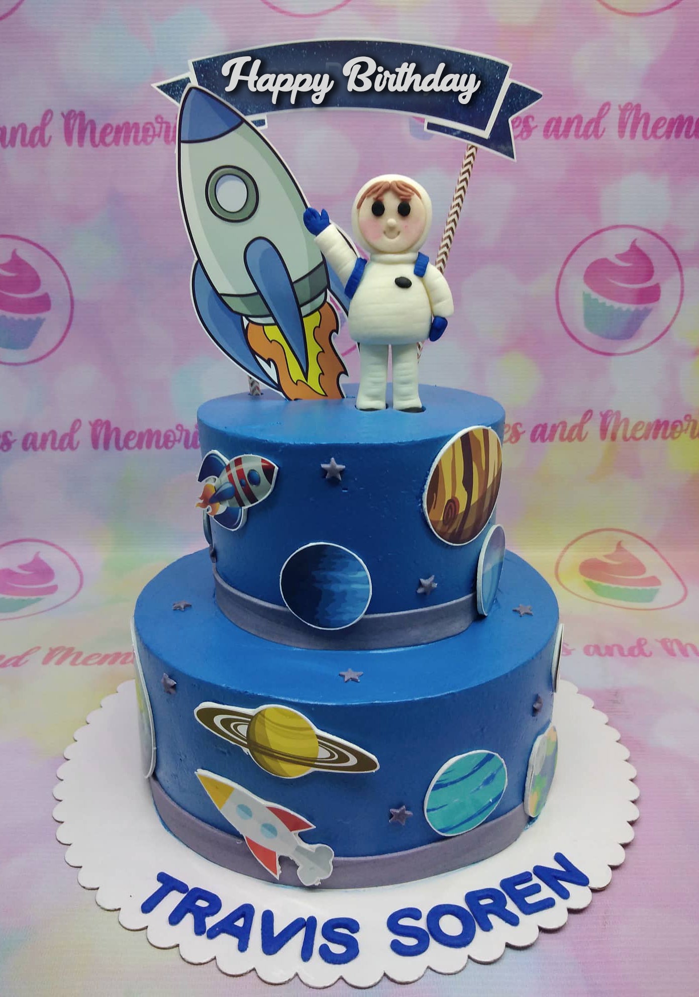 Two-tier blue space-themed birthday cake with an astronaut figurine, rocket printouts, and planet decorations.