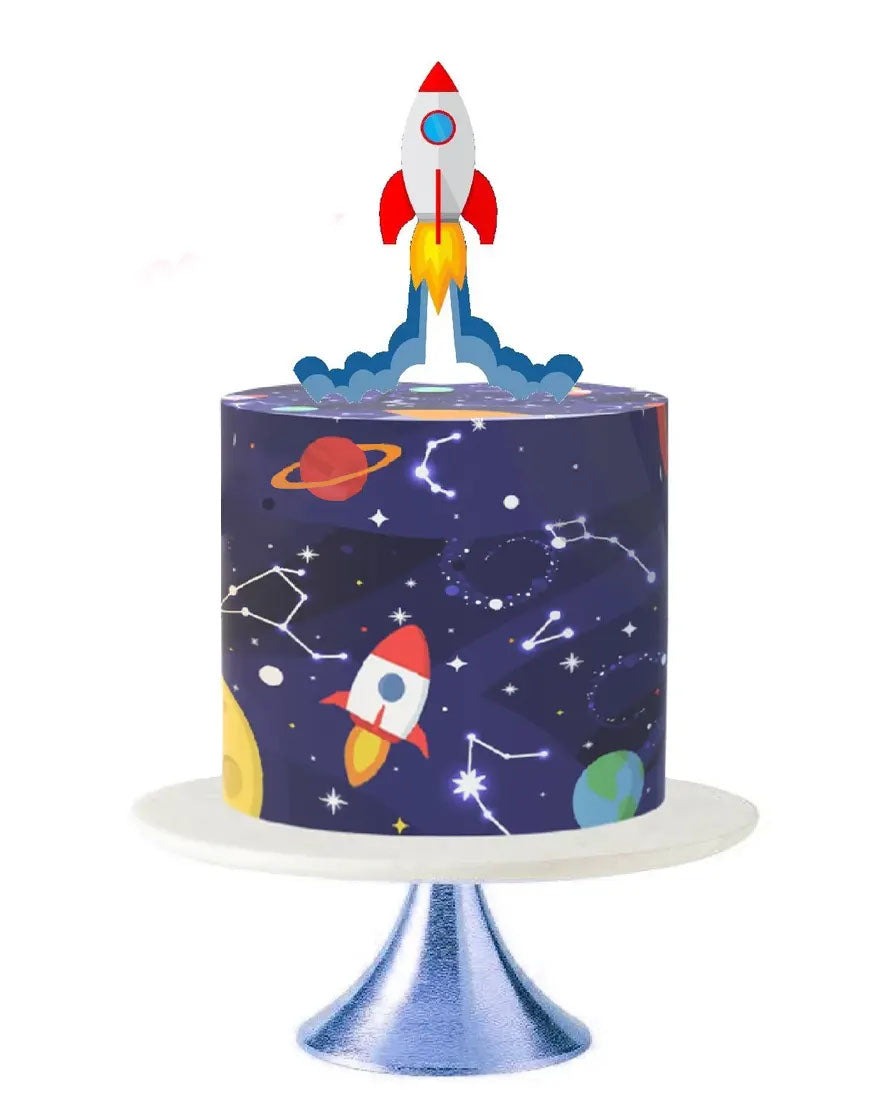 Space themed birthday cake with a rocket ship topper and galaxy print icing featuring planets and constellations.