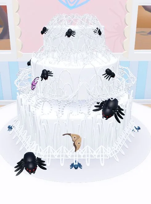 White 3-tier spider web cake with black spider and butterfly toppers and intricate white icing webbing.
