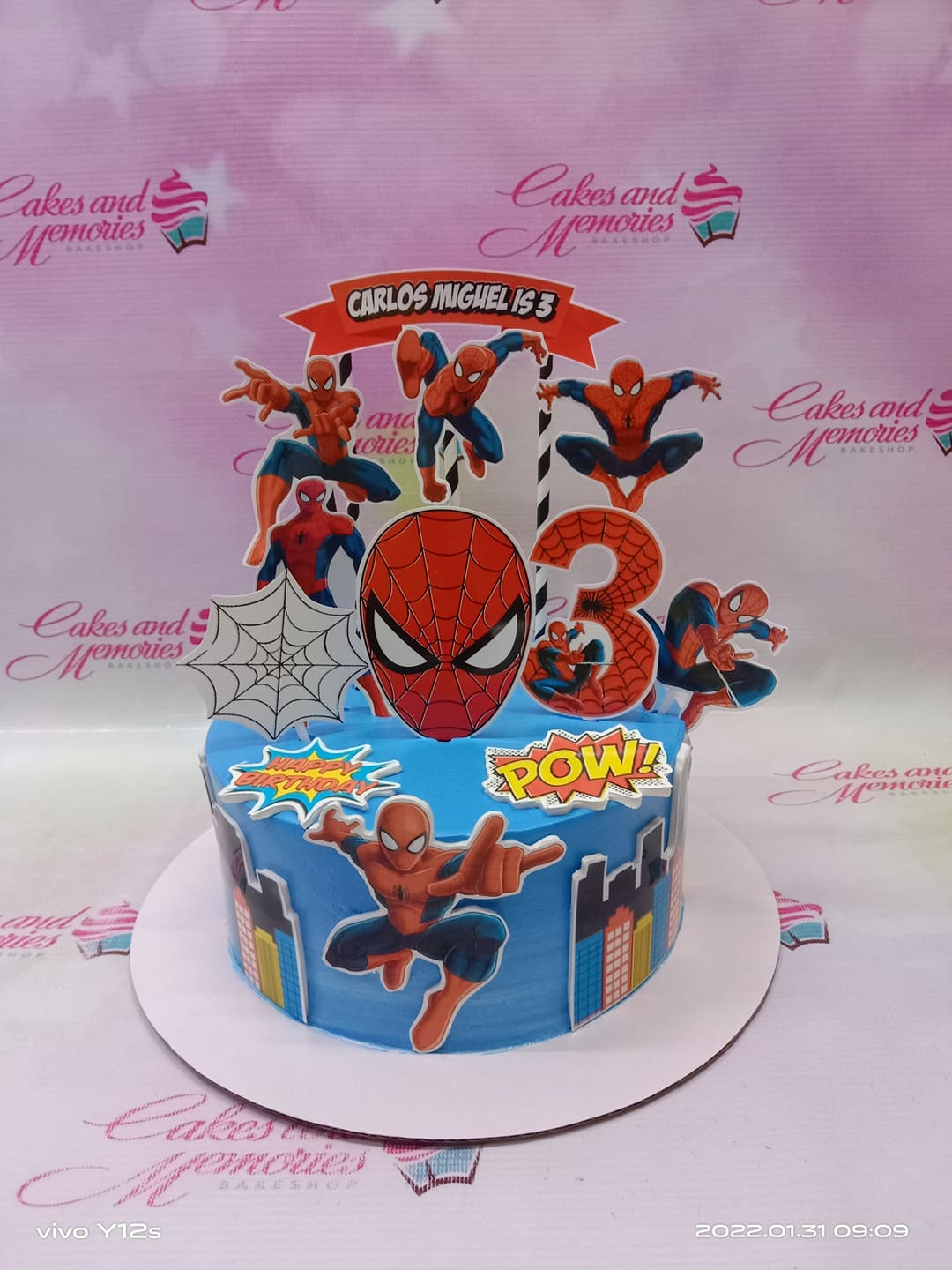 Blue Spiderman themed birthday cake with multiple character printouts, a large number 3, and city skyline decorations.