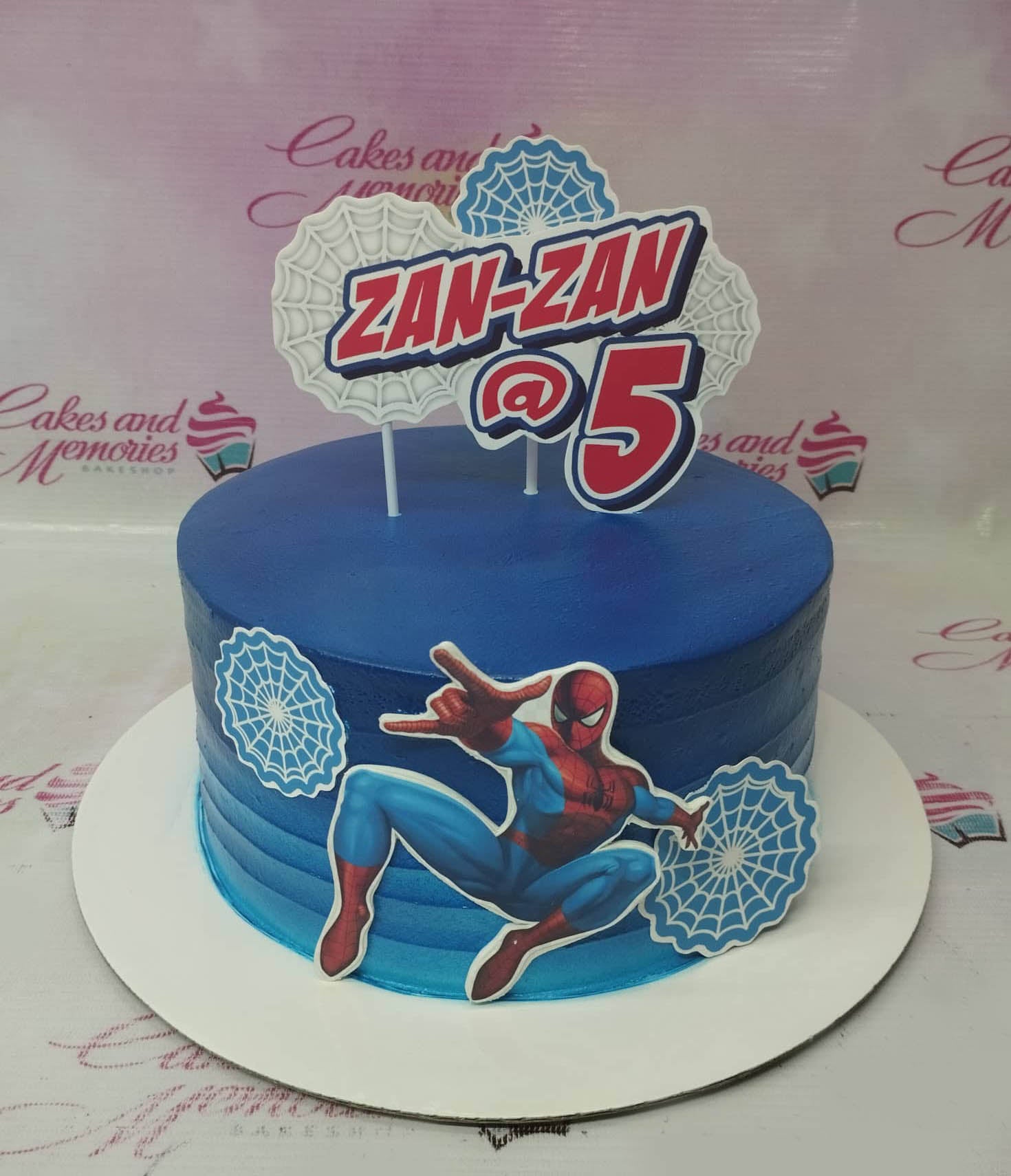 Blue Spiderman themed birthday cake with web printouts and a personalized name topper for Zan-Zan at 5.