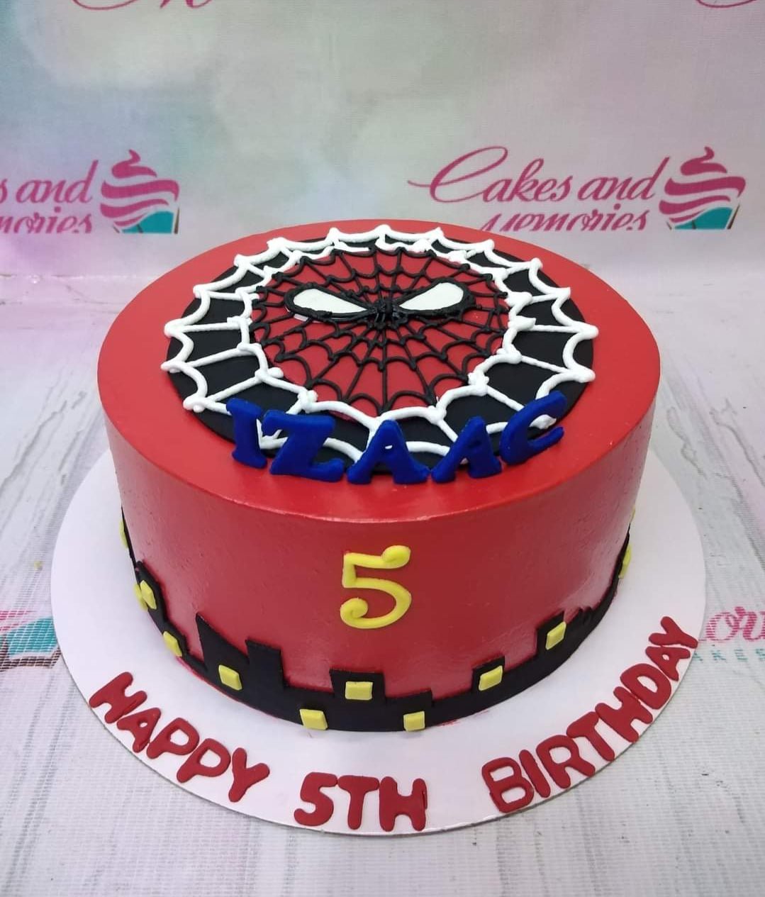 Red Spiderman themed birthday cake with a black and white web design on top and a city skyline silhouette around the base.