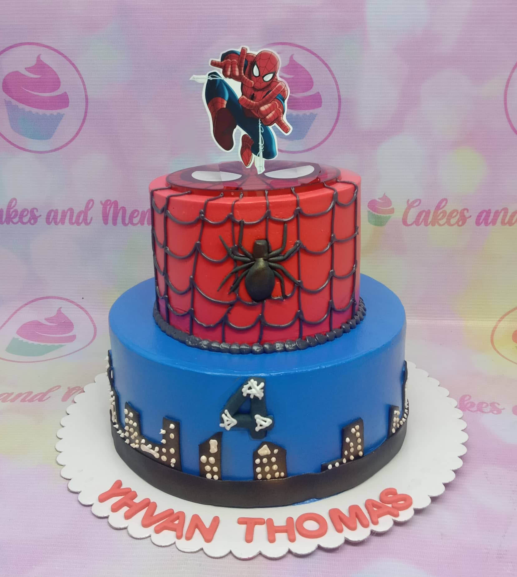 Two-tier Spiderman themed birthday cake with red webbed top tier and blue city skyline bottom tier featuring a Spiderman printout topper.