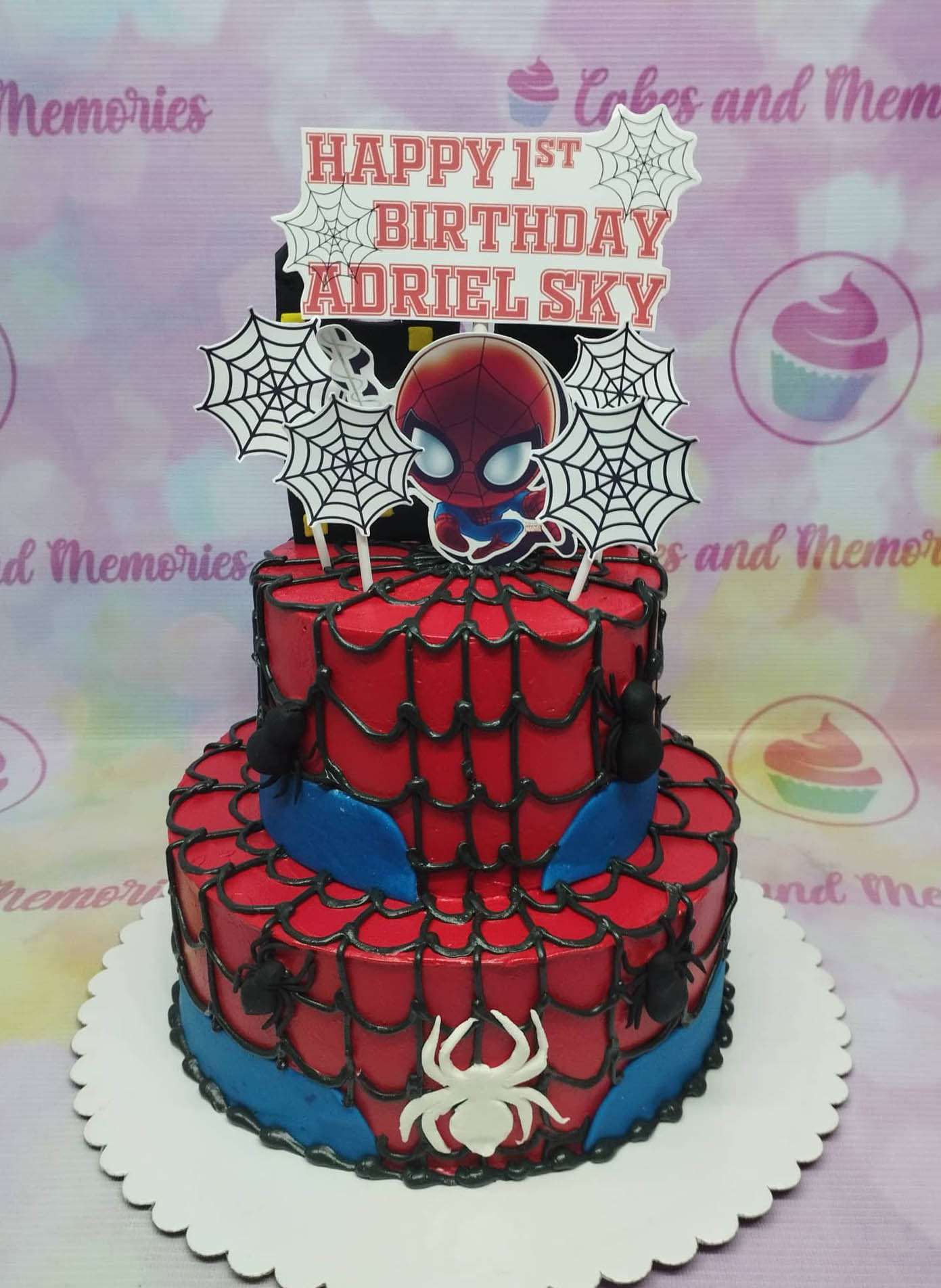 Two-tier Spiderman themed birthday cake in red and blue with black web icing and character toppers.