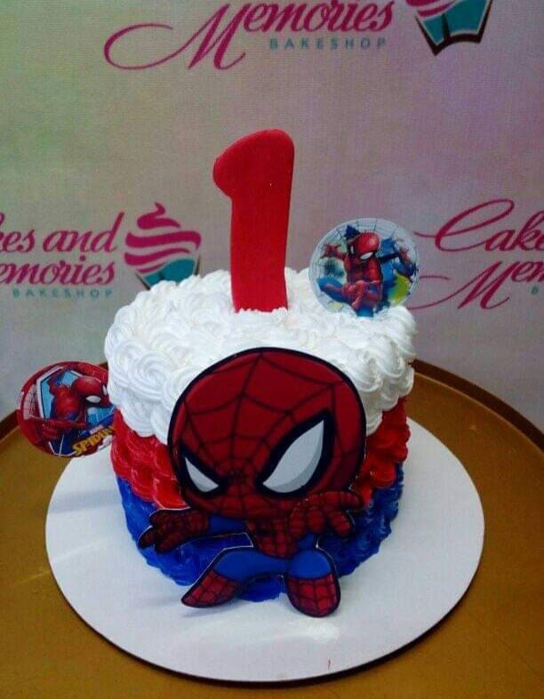Spiderman themed birthday cake with red, blue, and white icing rosettes, featuring a large Spiderman cutout and a red number one topper.