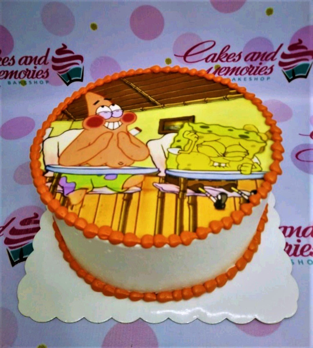 SpongeBob SquarePants and Patrick Star themed cake with orange icing borders and a large printed scene on top.