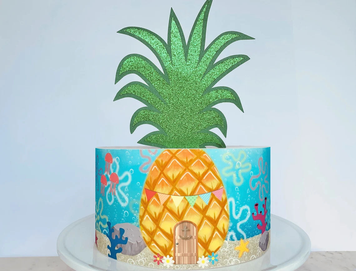 SpongeBob SquarePants pineapple house themed cake with a large green glitter pineapple leaf topper and underwater scene wrap.
