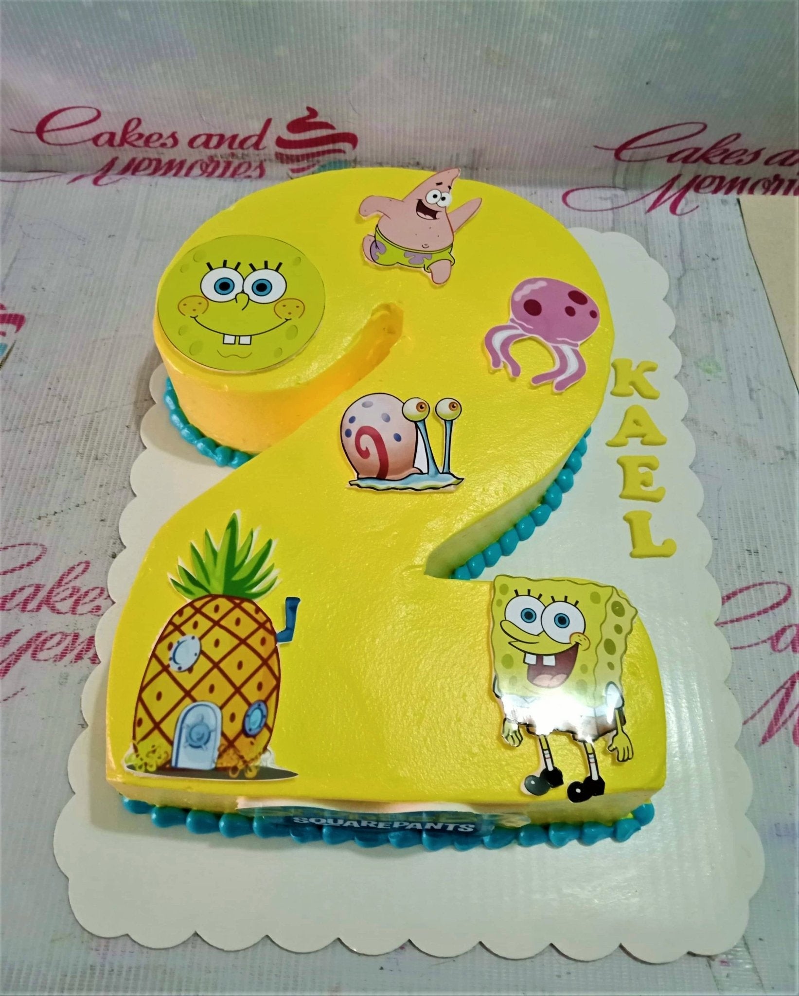 Yellow number 2 shaped Spongebob Squarepants birthday cake with character printouts and blue icing border