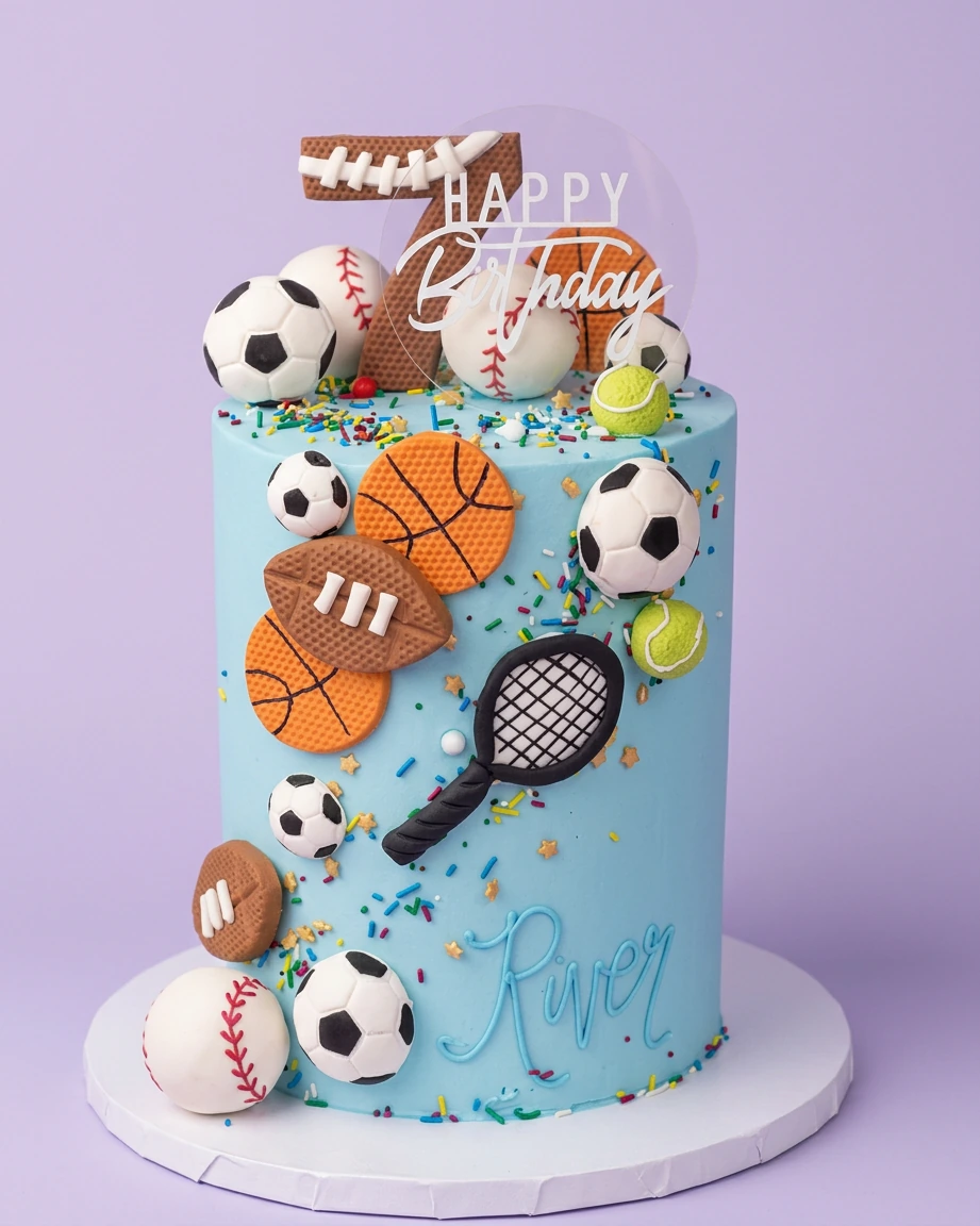 Tall light blue sports themed birthday cake for River's 7th birthday featuring fondant sports balls and a large number 7 topper.