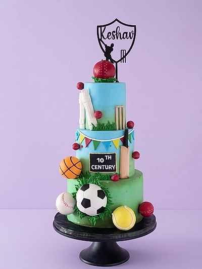 A three-tier sports-themed cake featuring cricket, basketball, soccer, and tennis elements with a personalized name topper.