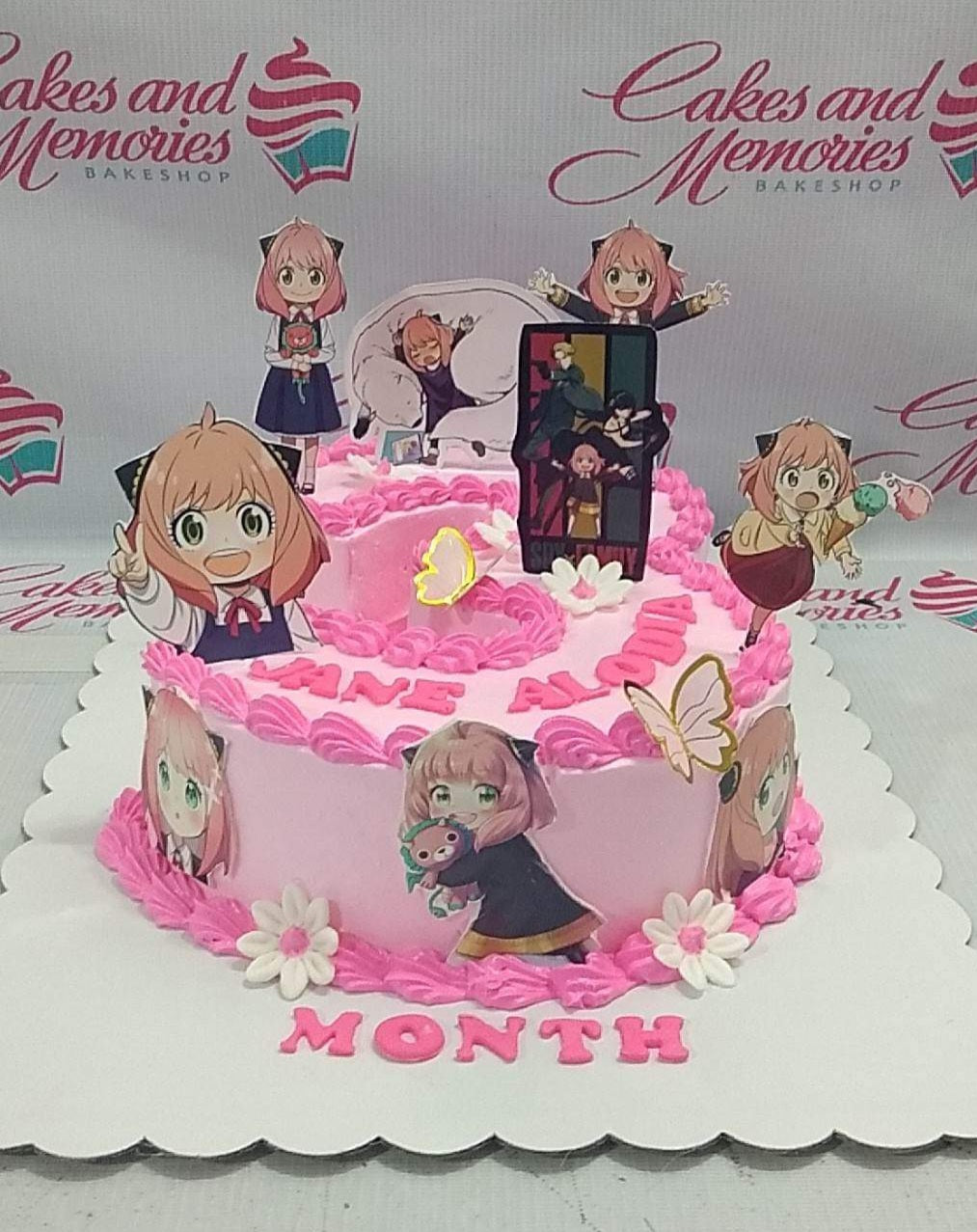 Pink Spy x Family Anya Forger themed birthday cake with pink icing rosettes and character printouts.