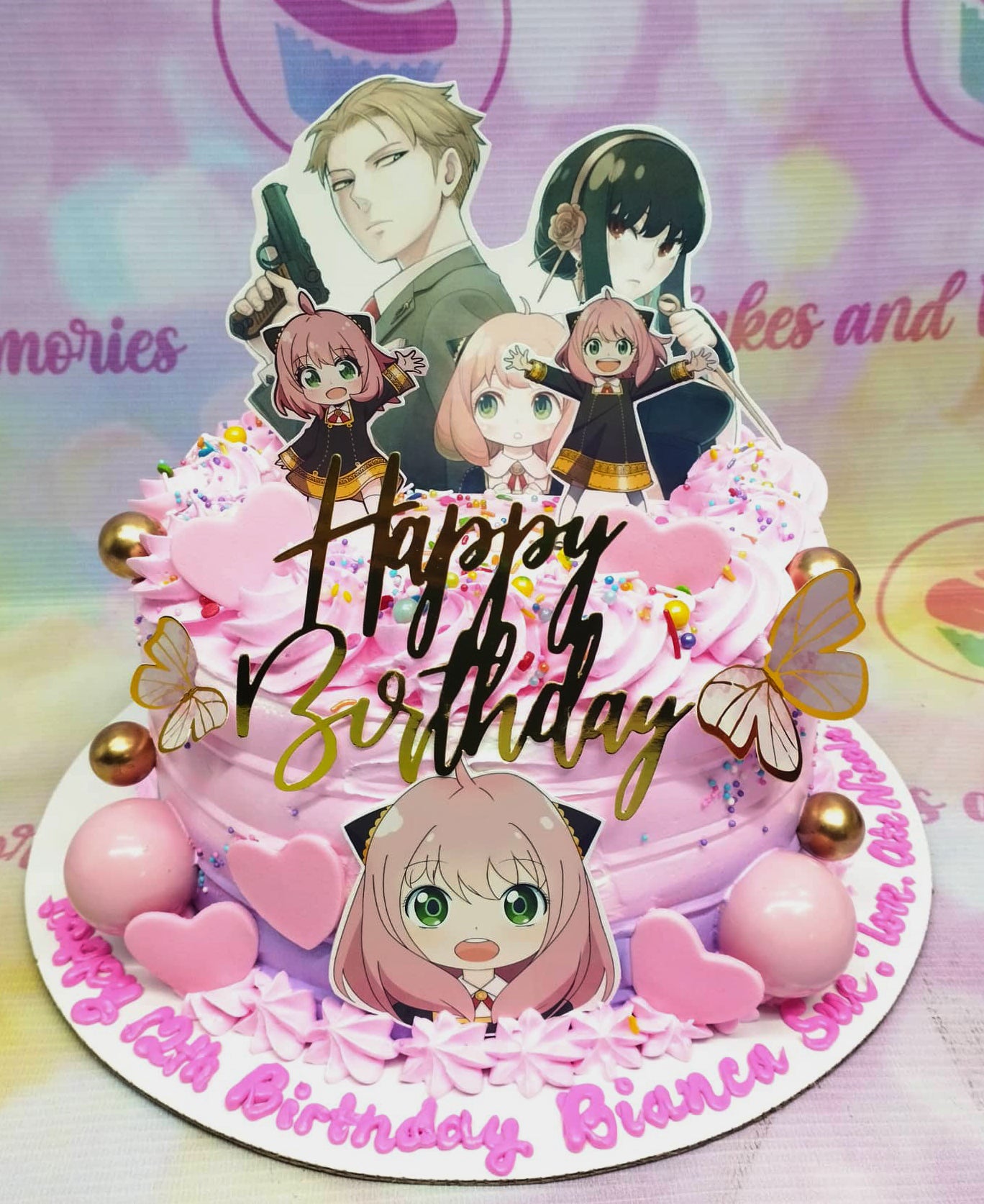 Pink and purple Spy x Family themed birthday cake with Anya, Loid, and Yor printout toppers, pink hearts, and gold spheres.