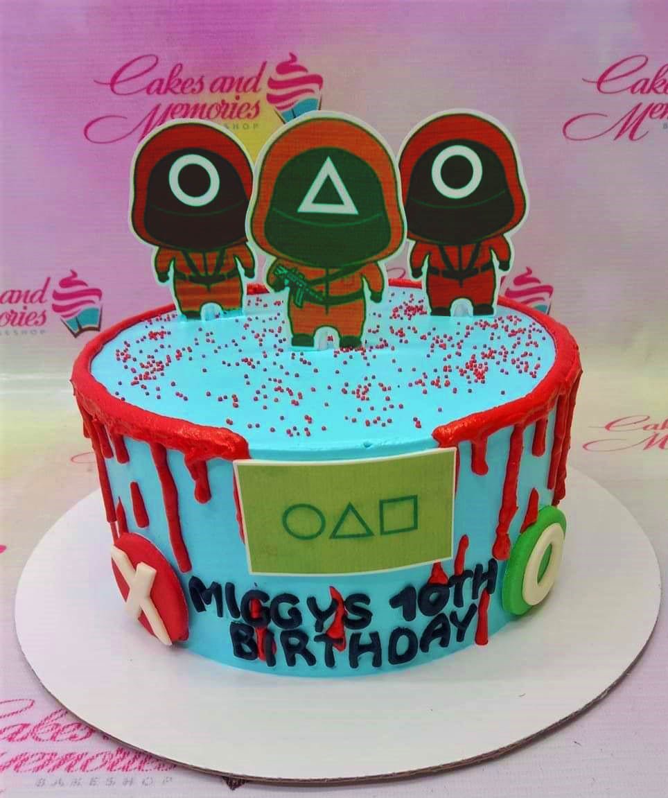Light blue Squid Game themed birthday cake with red drip icing, character printouts, and red sprinkles.