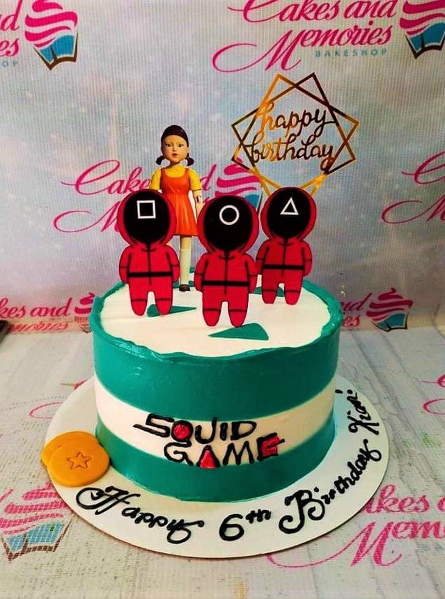 Squid Game themed birthday cake with teal and white stripes, featuring character printouts and a gold Happy Birthday topper.