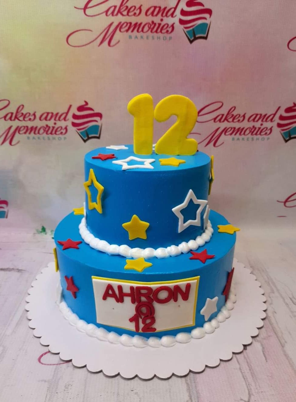 Blue 2-tier birthday cake with yellow, red, and white stars and a large yellow number 12 topper.
