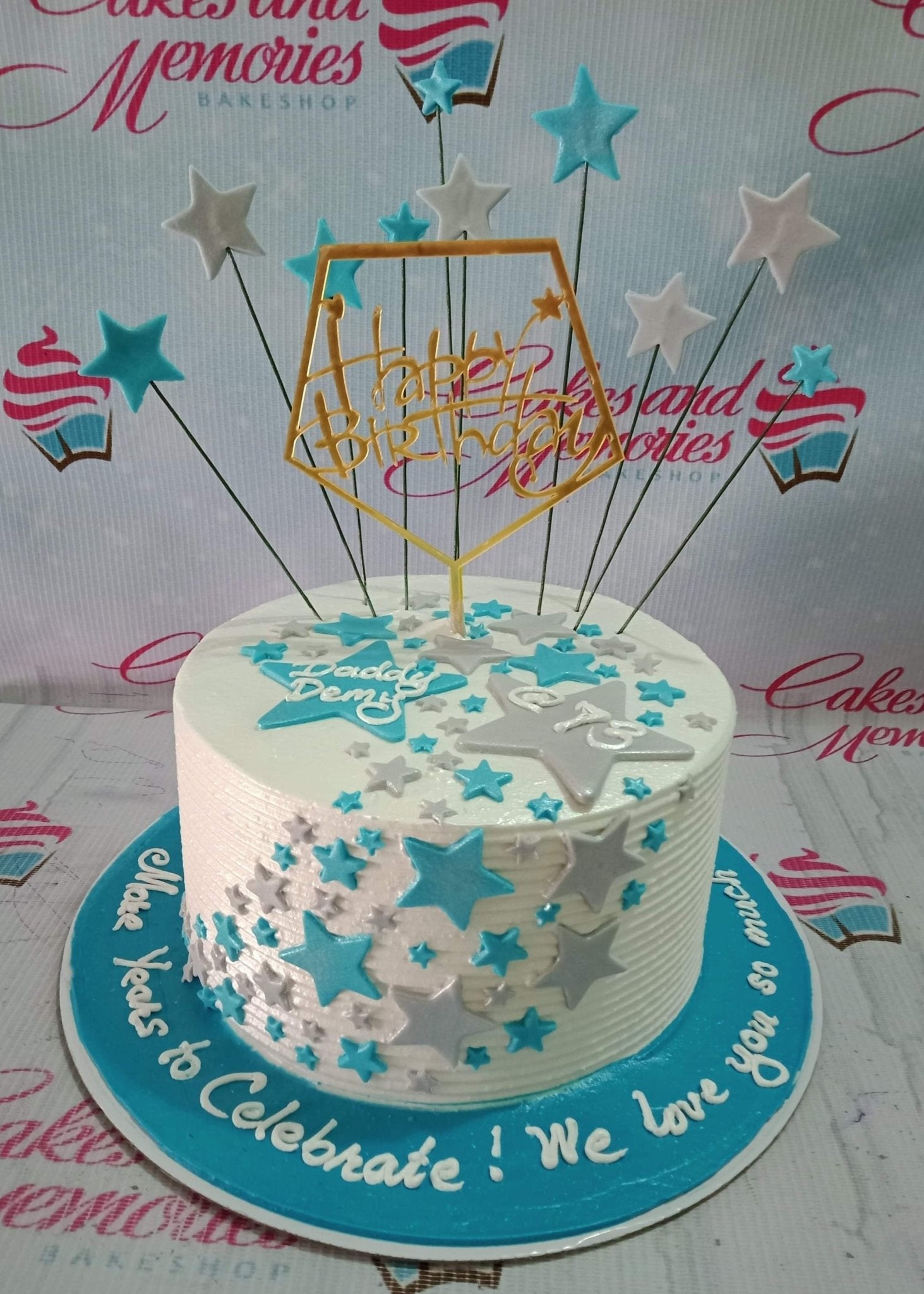 White 1-tier birthday cake with blue and silver fondant stars and a gold Happy Birthday topper