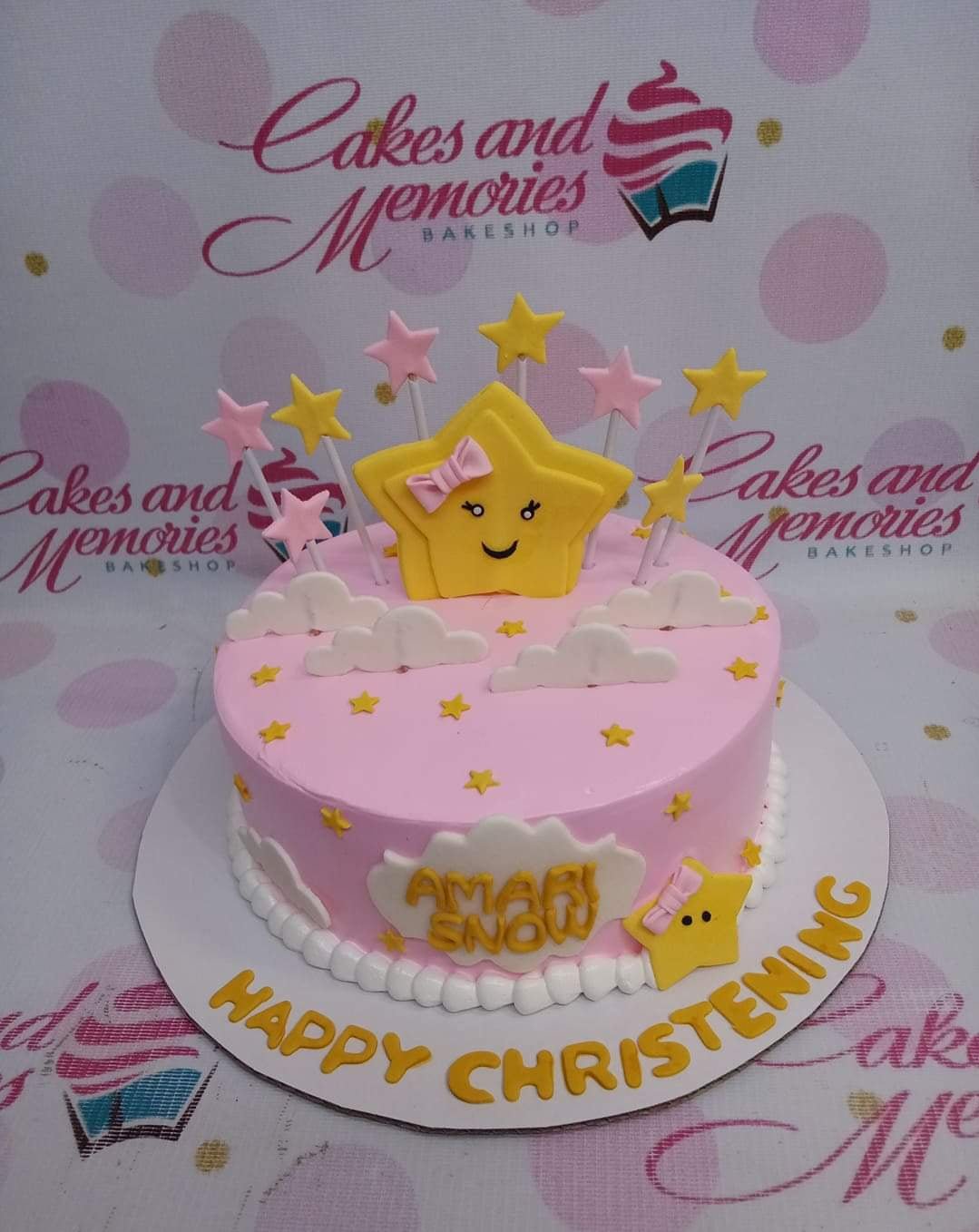 Pink christening cake with a large yellow star character, pink and yellow star toppers, and white fondant clouds.