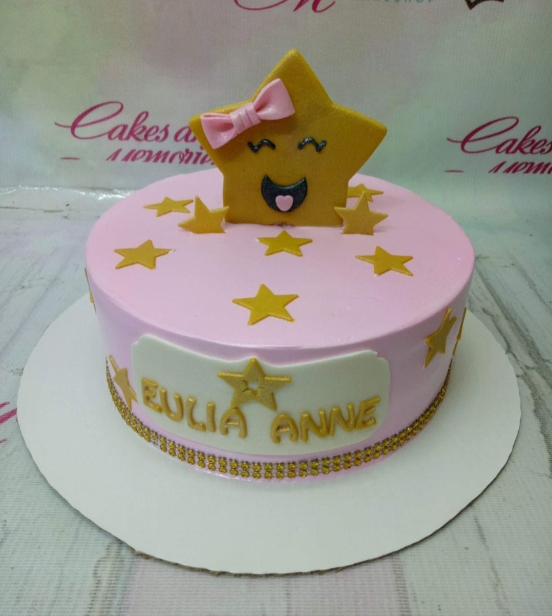 Pink round cake with a large smiling yellow star topper wearing a pink bow and smaller gold stars on the top and sides.