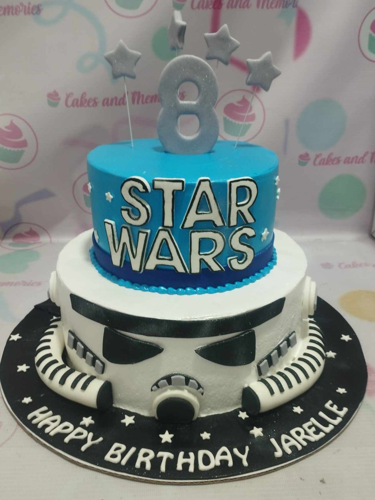 Two-tier Star Wars themed cake featuring a blue top tier with Star Wars logo and a white bottom tier designed as a Stormtrooper helmet.