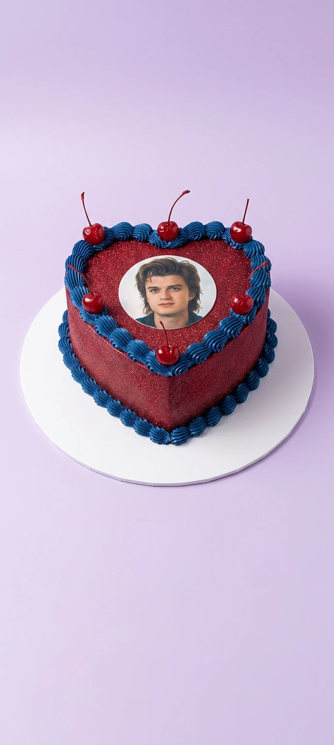 Heart-shaped dark red cake with blue icing borders and a printed photo of Steve Harrington from Stranger Things.