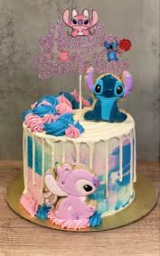 Stitch and Angel 1 Tier - blue, pink theme with Happy Birthday topper with Stitch and Angel and pink and blue icing swirls