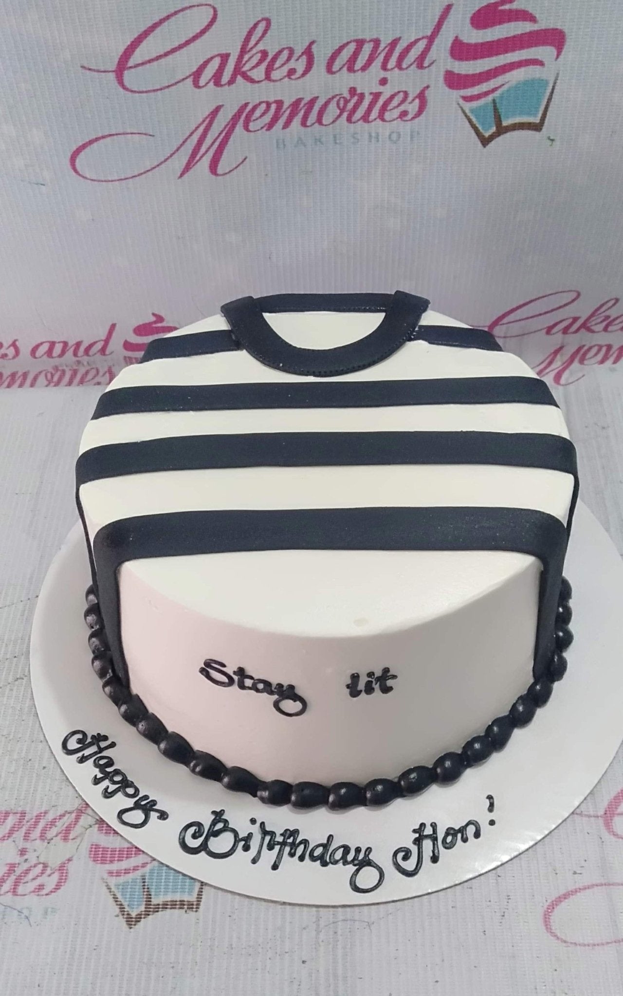 White fondant cake with black horizontal stripes resembling a shirt design and a black beaded border.