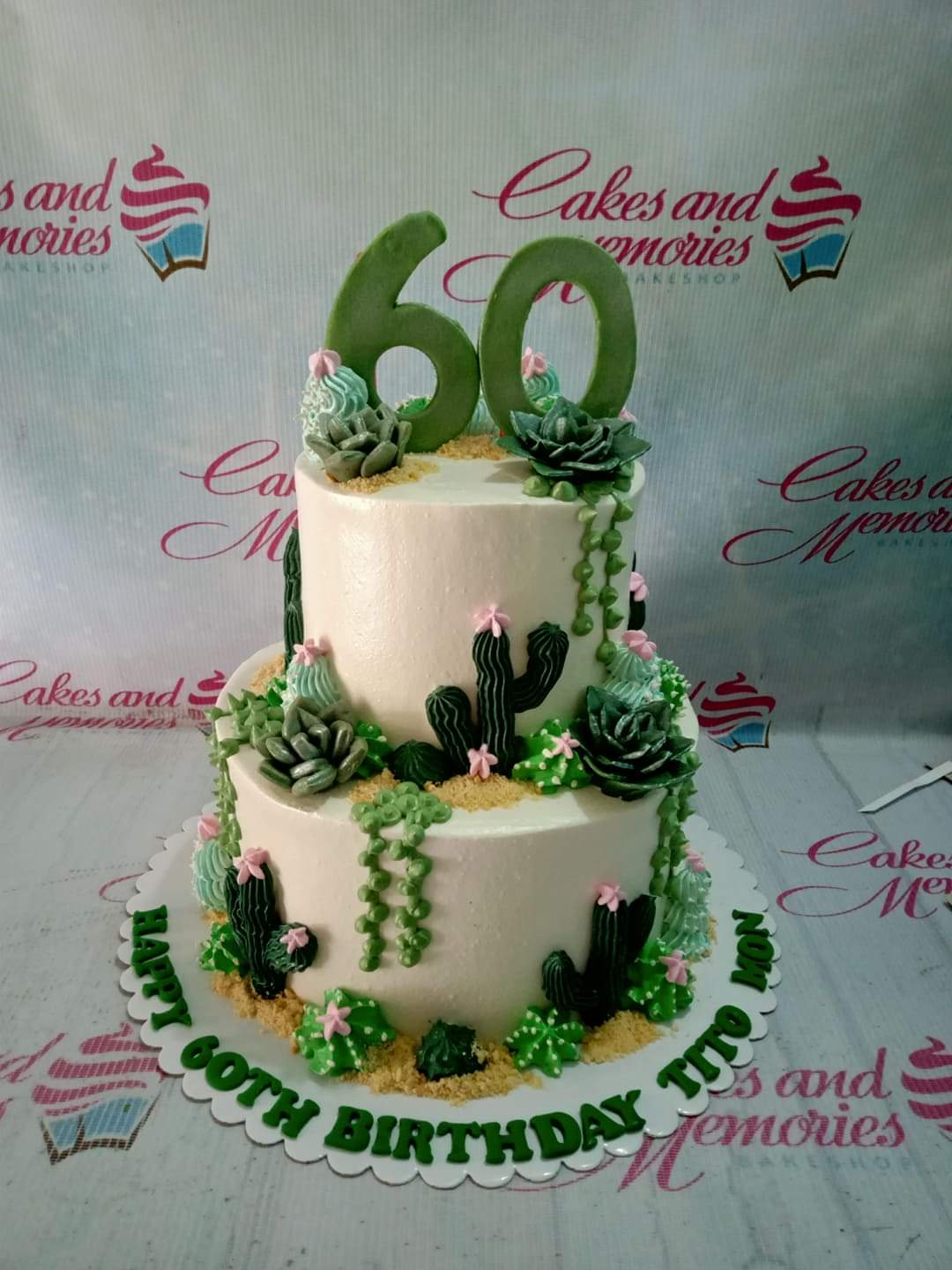 Two-tier white succulent and cactus themed birthday cake with green 60 topper and piped desert plants.