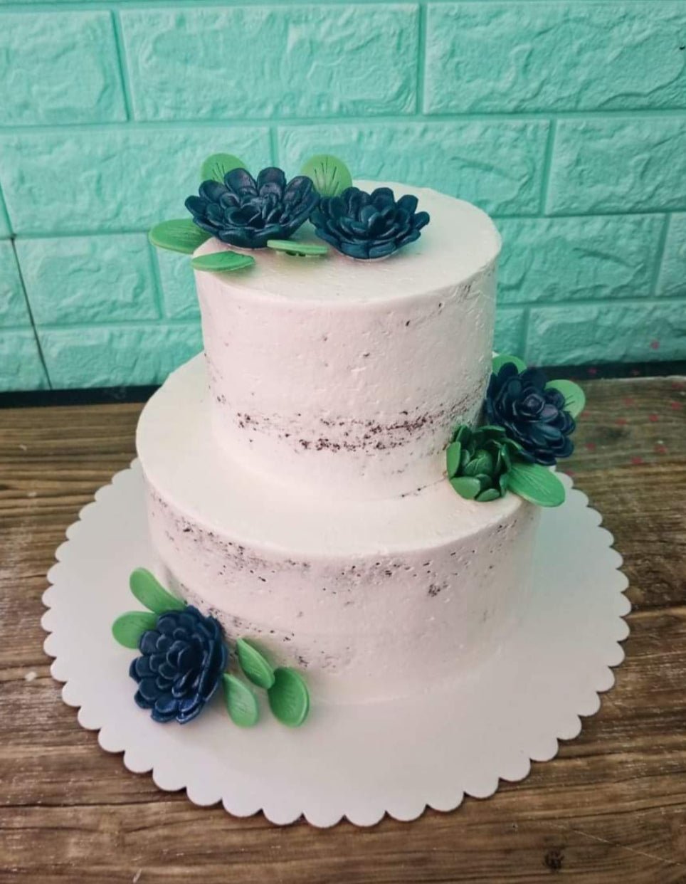 Two-tier semi-naked chocolate cake decorated with dark teal and green succulent-style edible flowers and leaves on a white base.