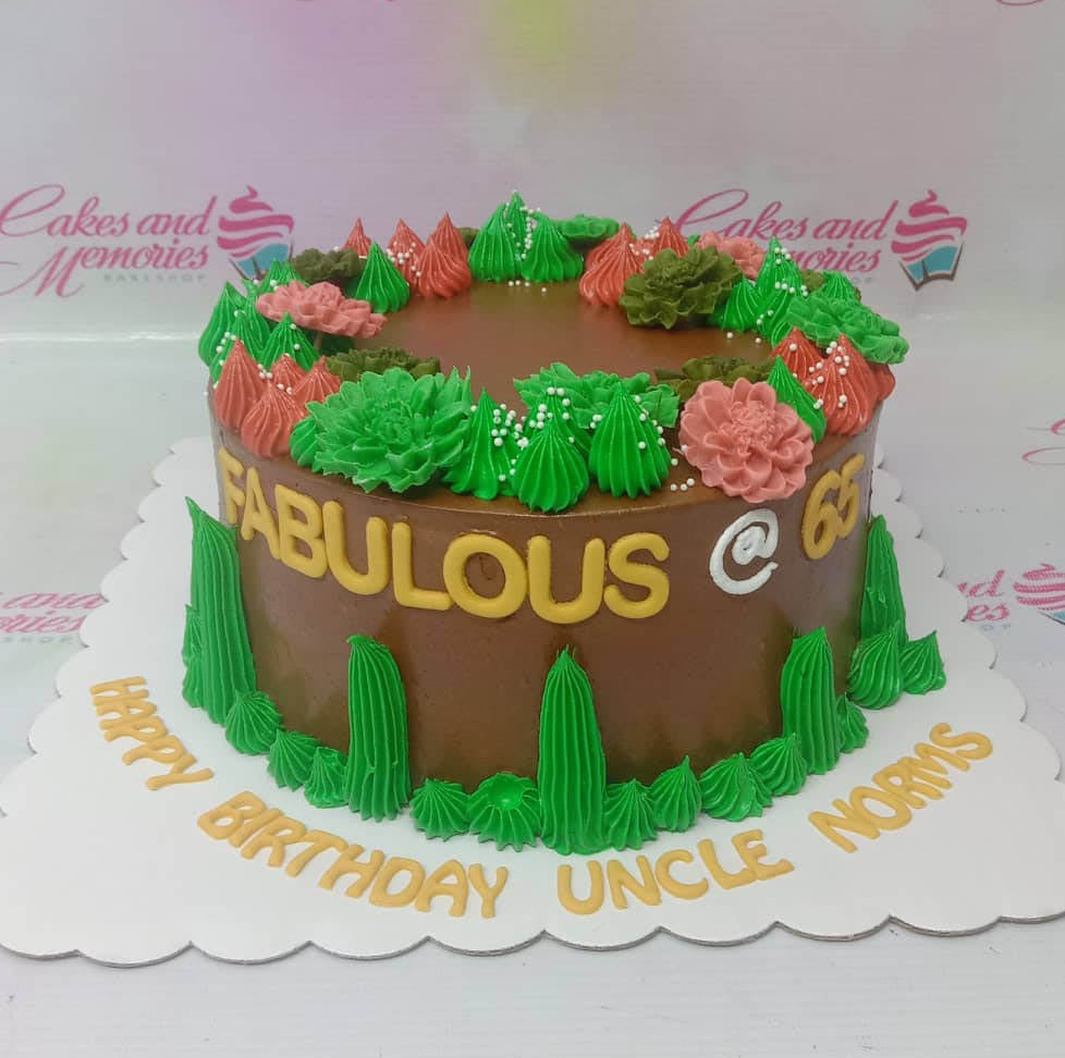 Brown chocolate cake with green and pink icing succulents and yellow gumpaste letters for a 65th birthday celebration.