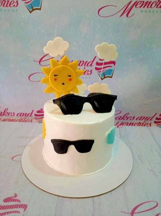 White minimalist cake with yellow sun and black sunglasses toppers, featuring white and blue fondant clouds.
