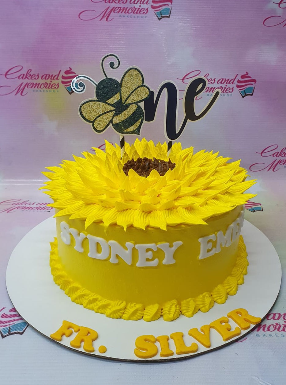 Yellow sunflower themed birthday cake with a glittery bee and 'one' topper, featuring yellow icing petals and white gumpaste name letters.