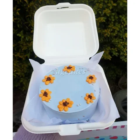 Light blue bento cake with orange piped icing sunflowers and silver dragees in a white styrofoam box.