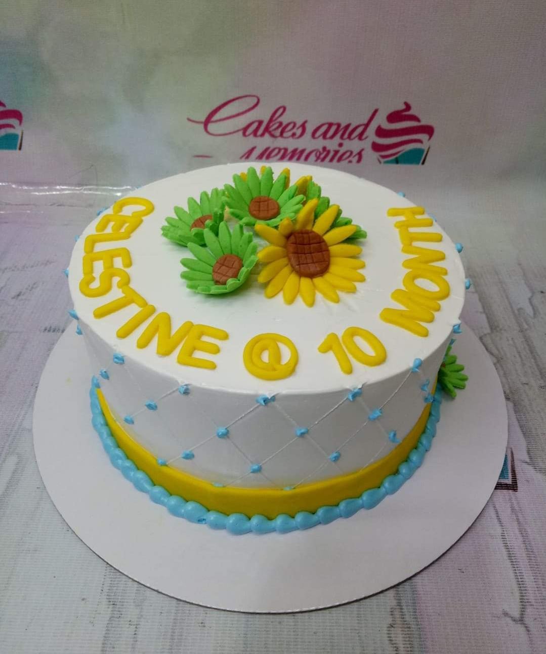White round cake with yellow sunflowers and blue piped borders for a 10-month celebration.