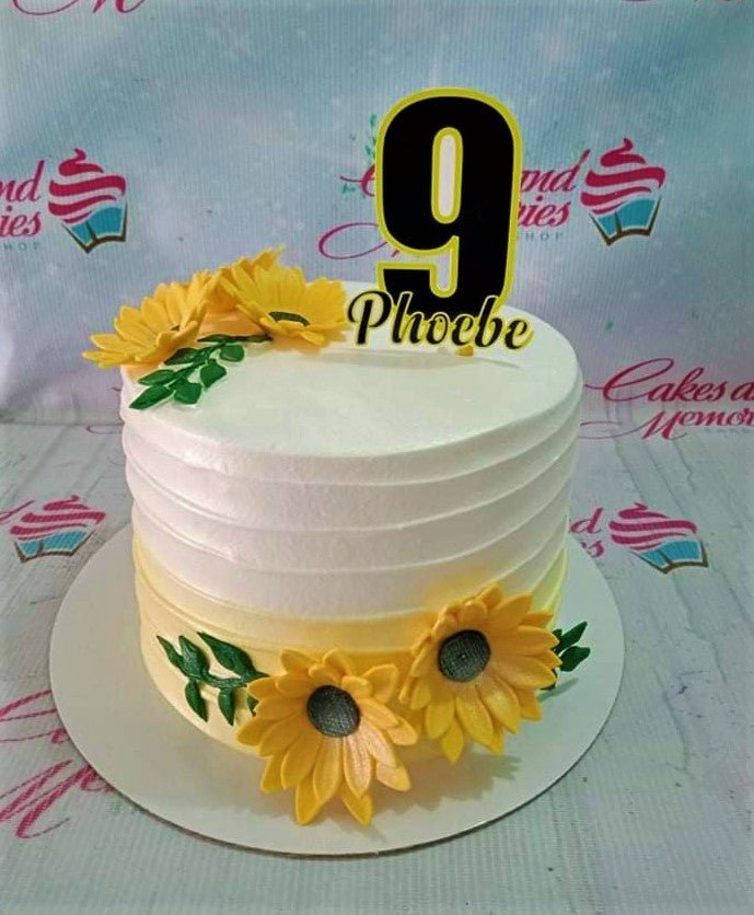White and yellow sunflower themed birthday cake with a black and yellow number 9 topper for Phoebe.