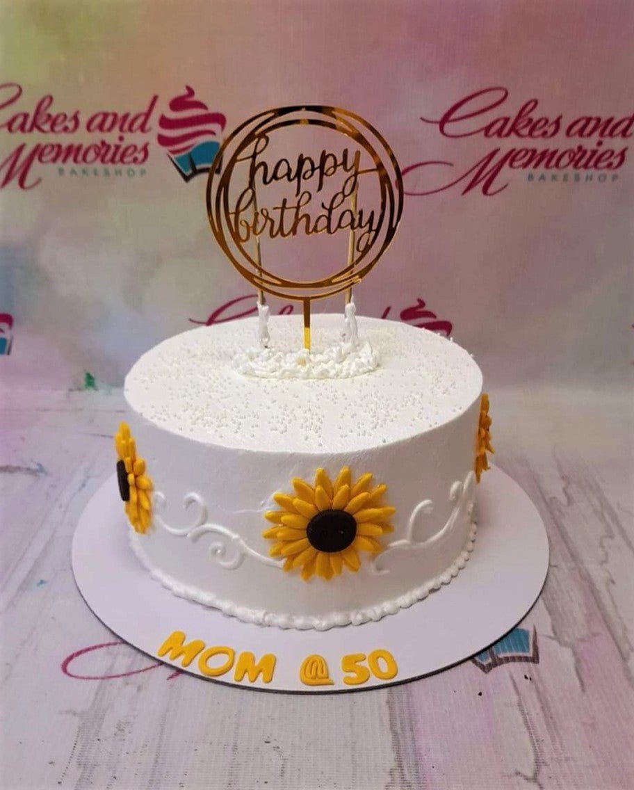 White round birthday cake with yellow fondant sunflowers, white icing swirls, and a gold Happy Birthday topper.