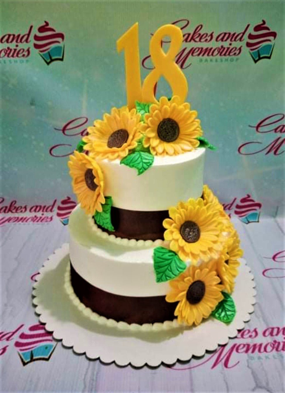 Two-tier white and brown sunflower cake with a large yellow number 18 topper and green fondant leaves.
